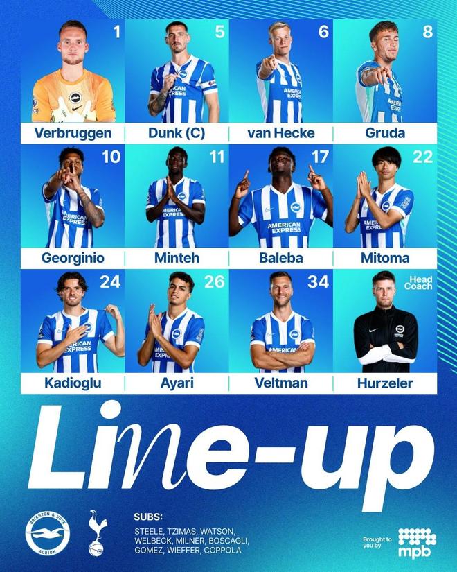 北京时间9月20日22点,英超第5轮布莱顿对阵热刺,赛前公布首发名单。