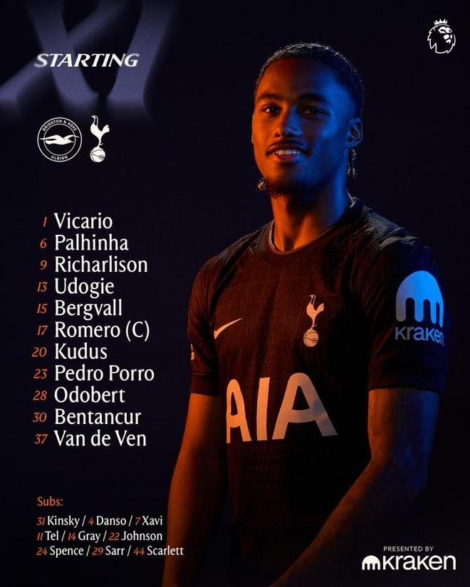 热刺首发:1-维卡里奥、6-帕利尼亚、9-里沙利松、13-乌多基、15-卢卡斯-贝里瓦尔、17-克里斯蒂安-罗梅罗、20-库杜斯、23-波罗、28-奥多贝尔、30-本坦库尔、37-范德芬