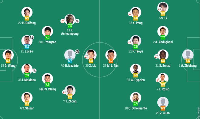 前锋:11-阿奇姆彭(F)(87'10-黄紫昌)、38-卢永涛(96'13-阿卜杜肉苏力)、40-纳萨里奥(F)(96'17-何小珂)