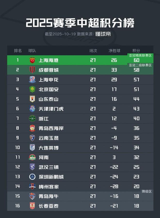 • 中超27轮积分榜:11队积分突破30分,仅剩3队争冠,降级4选2